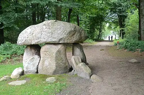 Anders Bundgaard's sandstone monuments include a statue of Holger Petersen and the Three-Hundreds-Stone. The three-metre-tall Three-Hundreds-Stone from 1912 stands at the spot where the three historical hundreds of laugs, Malt and Skads meet. The three men depicted on the stone are Hedeselskabet-founder Enrico Dalgas, innkeeper in Hovborg J. K. Sørensen and chief forester J. C. Sørensen. They all made significant contributions to the planting of the heaths around Hovborg.[3]