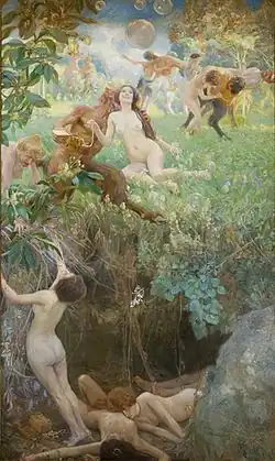 After four years, he returned to Barcelona. In addition to his paintings, he provided illustrations for several notable publications, including L'Esquella de la Torratxa.[1] Many of his drawings were signed "L'Alegret" (possibly a reference to Alegret, the Gascon troubadour). He also tried his hand at being a playwright. In 1909, the Teatre Apolo premiered his musical comedy La Canción de la Ninfa; written under the nom-de-plume "Emilio Roig", with music by Pedro Enrique de Ferrán.[2]