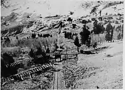 In 1868, Lucien Maxwell invested in a $8,000 15-stamp mill and 12 horse power steam engine built below the Aztec mine to service the same.[1] Ore was moved from the mine to the mill by burro originally. The same year, an arial tramway was installed to transport ore easier. Then in 1885, the mill was replaced by a 30 stamp mill by the Aztec mining and Milling Co. In 1921, The arial tramway was replaced with simple track and the mill was updated. In 1934, as an effort to process small rich deposits quickly, the mill was replaced by a ball mill. This mill continued to process small ore and remill tailings until its decommission in 1940.