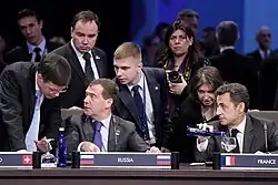 Prime Minister Jan Peter Balkenende, President of Russia Dmitry Medvedev and President of France Nicolas Sarkozy at the 2010 Nuclear Security Summit in Washington, D.C., on 14 April 2010.