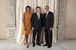 First Lady of the United States Michelle Obama, Prime Minister Jan Peter Balkenende and President of the United States Barack Obama at the Metropolitan Museum of Art on 23 September 2009.