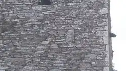 The castle features several defensive features such as bartizans, which are overhanging turrets that project from the walls of medieval fortifications and are often equipped with arrow slits. In addition, there is evidence that the castle once had a machicolation (an opening through which boiling liquids and stones were thrown at enemies) and, unusually, a portcullis.[3] On the eastern side of the castle, about halfway up, there is also a Sheela Na Gig, a figurative sculpture of a naked woman displaying an exaggerated vulva. These sculptures are found throughout Europe, especially in Ireland, Great Britain, France and Spain, on cathedrals, castles and other buildings. Scholars do not agree on the origin of these figures. A popular theory is that the sculptures were used to ward off death, evil and demons. Other theories suggest that the figures represent a fertility goddess or pre-Christian mother. However, their origin and meaning remain uncertain.