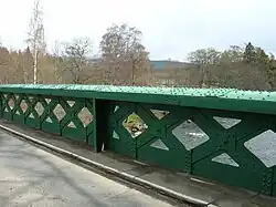 Crathie Bridge (1854–1857) is a 125-foot single span across the River Dee to the royal Balmoral estate.[23][24][25][26] The bridge had first been drawn with a form of the Brunel truss echoing his Royal Albert Bridge at Saltash.[27] The bridge as constructed though used the C-shaped open form of the upper flange, as used for the Eastern Bengal Railway. As the bridge was only for light road traffic, it was also possible to replace the solid web of the girder above the roadway level with an openwork lattice, making the view from the bridge visually more appealing for its illustrious resident. Despite this, Her Majesty was 'not amused' by the bridge.[23][24]