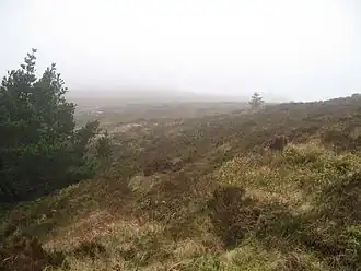 The southern part of the hills is largely afforested with conifer plantations, on the northern side there is extensive heathland and blanket bog. The Ballyhoura Mountains have been listed as a Special Area of Conservation. The blanket bog occurs in most of the flatter areas and features such species as heather (Calluna vulgaris), with deergrass (Trichophorum cespitosum), hare’s-tail cottongrass (Eriophorum vaginatum), common cottongrass (Eriophorum angustifolium), bilberry (Vaccinium myrtillus) and crowberry (Empetrum nigrum). The wet heath is dominated by heather, cross-leaved heath (Erica tetralix) and bilberry accompanied by a range of mosses and liverworts. The dry heath is more species-rich, with bell heather (Erica cinerea), green-ribbed sedge (Carex binervis), tormentil (Potentilla erecta), bent grasses (Agrostis spp.) and mosses such as Hypnum jutlandicum.[3]