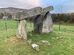 The dolmen sits at the southern end of a large cairn, of approximately 30x10 metres, the north end of which also contains a cist. Its three metre long capstone, with a notable notch similar to that of Legananny Dolmen, had previously fallen, but was re-set during excavations in 1963.[2] The granite capstone is balanced on the tips of the three portal stones.[3]