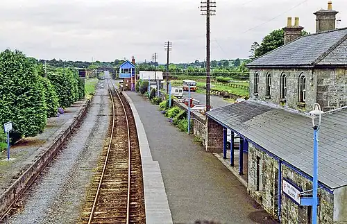 - ^ The 1993 image shows the track singled and goods shed demolished though the signal box remains. The goods yard is now a car park occupied by a CIÉ school bus. The cattle loading platform is evidenced in the top right quadrant.