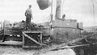 Port Ballyraine would have seen the regular importation of timber to the building trade and also the poles to carry out the Electrification of Rural Ireland programme during the 1930s.[4] The port was closed to commercial shipping in the 1960s. The 19th-century shipping warehouses were demolished in 2001,[5] a coal yard remains at the Port Bridge.[6] The Polestar monument located on the Port Bridge Roundabout serves as a reminder of the area's past. Created by Locky Morris, Its shape alludes to the outline of a boat, as well as having a locomotive (train track) theme, to commemorate the fact that both forms of transportation played a major part in the town's development in the past.