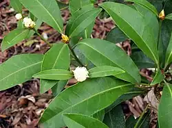 Leaves are alternate on the stem, not toothed, lanceolate to reverse ovate in shape, glossy green, 8 to 15 cm long, and 2 to 5 cm wide.[3] A pair of glands occurs on the edge of the leaf, about 5 mm from where the stalk joins the leaf. Leaf stalks are 2 to 4 cm long, with a grooved channel on the upper side.