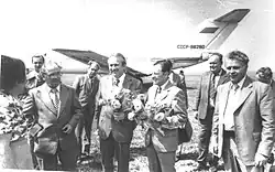 9 May 1979: a Yakovlev Yak-40C2 (ССССР-88280) at Bălți Airport (Bălți-City Airport). Departure of Jozef Lenárt and Miloš Jakeš from the Moldovan Soviet Socialist Republic. In the foreground (from left to right): Ivan Bodiul (second from left), First Secretary of the Communist Party of Moldova, Jozef Lenárt, First Secretary of the Communist Party of Slovakia, Miloš Jakeš, Secretary of the Communist Party of Czechoslovakia and Semion Grossu, Chairman of the Council of Ministers of the Moldovan SSR, at Balti airport.