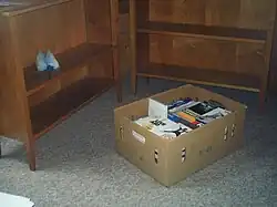 Banana boxes are popularly reused for storage or transport, for example as moving boxes, for archiving, used book markets, in storage areas or for humanitarian logistics.[6] An important reason for these uses is that banana boxes usually are affordable and easy to obtain, as they are often given away for free from many grocery stores[7][8][9] that otherwise would have to dispose of them. The boxes are relatively robust (for cardboard boxes), and their quasi-standardized shape makes them easy to stack. Some stores charge for banana boxes, and the profit may, for instance, go to charity.[10][11] A disadvantage of using banana boxes for moving may be the size, and that the bottom may not be sufficiently durable.[12][13] They can also start to smell due to juices that have settled from the bananas during transport.