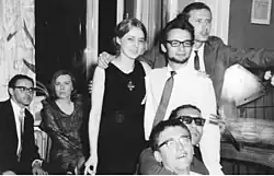 ![]() A group of so-called banana youths including Jan T. Gross and Aleksander Smolar (front), Irena Grudzińska, Jan Lityński and Adam Michnik (standing), and Jan Kofman and Barbara Skowrońska (seated), 1967 | |