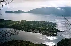 The main island, Banda Neira (centre) viewed from the peak of Gunung Api volcano. In the background is Lontar Island (Banda Besar).