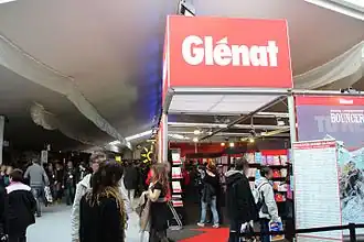 The Glénat booth at the 2013 Angoulême BD festival with on the right one of its most important early artists, François Bourgeon (2014), whose heroine Isa from Les Passagers du vent was exemplary of the new historical realism in Franco-Belgian BDs