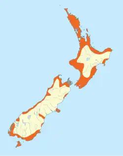 Approximate known distribution of the banded kōkopu on a map of New Zealand