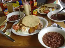 The main characteristic of this dish is the generous amount and variety of food in a traditional bandeja paisa: red beans cooked with pork, white rice, carne molida (ground meat), chicharrón, fried egg, plantain (plátano maduro), chorizo, arepa, hogao sauce, black pudding (morcilla), avocado and lemon.[1] It is served in a platter or a tray.[2]