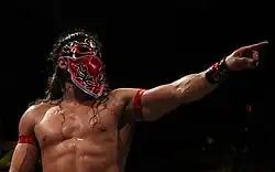 Starting in 2018, Bandido started to work more for promotions outside Mexico, primarily in the United States, where he often teamed with Flamita under the team name "MexaBlood". On March 17, 2018, Bandido and Flamita defeated the teams Aeroboy and Séptimo Dragón, and The Rascalz (Dezmond Xavier and Zachary Wentz) to win the vacant The Crash Tag Team Championship.[14] Two months later, Bandido became a double champion in The Crash when he won The Crash Cruiserweight Championship, defeating Dezmond Xavier and Laredo Kid for the vacant championship.[15] Through Flamita's contacts in Japan, Bandido worked his first two tours with Dragon Gate in January and June 2018.[16] During the British promotion Progress Wrestling's tour of the United States, Bandido and Flamita defeated A. R. Fox and Chris Brookes to win the Progress Tag Team Championship.[17] Bandido teamed up with Rey Mysterio and Rey Fénix in the main event of the Indy wrestling super show All In, losing to The Golden Elite team of Kota Ibushi and The Young Bucks (Matt Jackson and Nick Jackson).[18] MexaBlood traveled to England at the end of September 2018 to work once more for Progress Wrestling. On September 30, the duo lost the Progress Tag Team Championship to Aussie Open (Kyle Fletcher and Mark Davis).[19] Mexa Blood were stripped of the tag team championship on October 7 for reasons that were never made public. On March 23, 2019, Jonathan Gresham won The Crash Cruiserweight Championship from Bandido; the match also included Flamita and Shane Strickland.[20] After losing the cruiserweight title, Bandido challenged Rey Horus for The Crash Heavyweight Championship on July 5 and lost.[21] In November 2019, Bandido defeated Rey Horus and Marty Scurll to win the heavyweight championship in a show in Tijuana.[21][22]