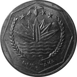 1 taka is a metal coin of the Bangladeshi taka. One taka coin was first issued in 1974.[1] At present one taka currency is in use in Bangladesh.
