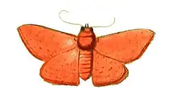 Upper side: antennæ brown and setaceous. Palpi, head, neck, thorax, abdomen, and wings reddish flesh-coloured; the latter having some very faint waved lines crossing them. Cilia dark brown. Under side: breast, sides, legs, and abdomen coloured as on the upper side. Wings yellowish, with many small narrow streaks. On the external edges of the anterior wings is a dark brown patch, near the tips. Cilia dark brown. Wing-span 1¼ inches (32 mm).[1]