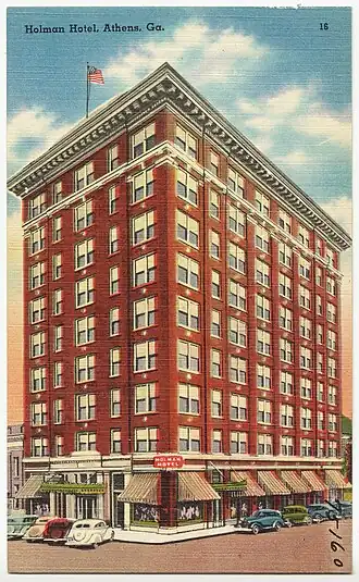 The Bank of America Building, formerly known as the Holman Hotel, is a commercial and financial building in Athens, Georgia. It is the tallest building in the city with 10 floors. The building was originally designed as an office building, but it was later converted for hotel use, and again in the 1960s it was remodeled in the Colonial revival style for banking purposes.[3] Inside the building, fire insurance maps show that the building, not including the penthouse, has a height of 120 feet.[4] It is also the official headquarters for Bank of America for the Athens area.