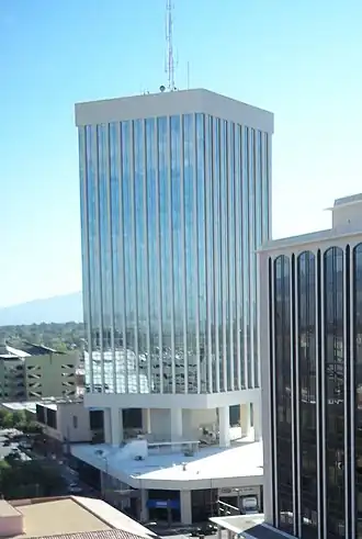 The Bank of America Plaza (formally Arizona Bank Plaza) is a high-rise office building which was built in 1977 and is located in downtown Tucson, Arizona. It was designed by Friedman & Jobusch and built by DEFCO Construction Company.[4] It took over the top spot from the Pima County Legal Services Building, which was the tallest building from 1967 to 1977. It was the tallest building in Tucson from the time of its completion in 1977, until 1986, when the UniSource Energy Tower was completed.[5] It is located at 33 North Stone Avenue, at the southwest corner of Stone Avenue and Pennington Street.[6] The Bank of America Plaza is one of three major skyscrapers in the downtown Tucson area that compose the highest part of the city's skyline, the other two being the One South Church (formerly UniSource Energy Tower) and the Pima County Legal Services Building.