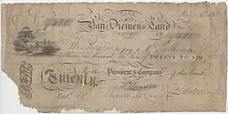 The Bank of Van Diemen's Land started issuing its official banknotes in 1825. The bank held a commercial monopoly in Van Diemen's Land until the establishment of the Derwent Bank in 1828.[8]