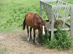 The Bankers' small stature can be attributed, in part, to limited nutrients in their diet.[17] They graze mostly on Spartina grasses but will feed on other plants such as bulrush (Typha latifolia), sea oats,[18] and even poison ivy.[19] Horses living closer to human habitation, such as those on Currituck Banks, have sometimes grazed on residential lawns and landscaping.[18] Domesticated Bankers raised on manufactured horse feed from an early age tend to exhibit slightly larger frames.[17]