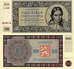 In 1945, four kinds of banknotes of Czechoslovak koruna were introduced. The first were issues of Bohemia and Moravia and Slovakia, to which adhesive stamps were affixed. Denominations issued were 100, 500 and 1000 korun. The second (dated 1944) were printed in the Soviet Union and were issued in denominations of 1, 5, 20, 100, 500 and 1000 korun. The third were locally printed notes issued by the government in denominations of 1, 5, 10, 20, 50, 100, 500, 1000 and 2000 korun. The fourth were issues of the National Bank of Czechoslovakia, in denominations of 1000 and 5000 korun. The National Bank issued 500 korun notes from 1946, whilst the government continued to issue notes between 5 and 100 korun, the 1 koruna note being replaced by a coin in 1946.