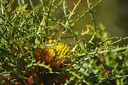 Banksia horrida is a species of shrub that typically grows to a height of 2 m (6 ft 7 in) and has hairy stems. The leaves are narrow linear in outline, 40–140 mm (1.6–5.5 in) long and 5–10 mm (0.20–0.39 in) wide on a petiole up to 15 mm (0.59 in) long. There are between five and twelve sharply pointed, triangular teeth on each side of the leaves. The flowers are arranged in heads of between thirty-five and sixty with densely hairy, linear involucral bracts up to 30 mm (1.2 in) long at the base of the head. The flowers have a yellow perianth 24–32 mm (0.94–1.26 in) long and a cream-coloured pistil 23–31 mm (0.91–1.22 in) long. Flowering occurs from April to June or in August and the follicles are egg-shaped, 11–12 mm (0.43–0.47 in) long and hairy.[2][3]