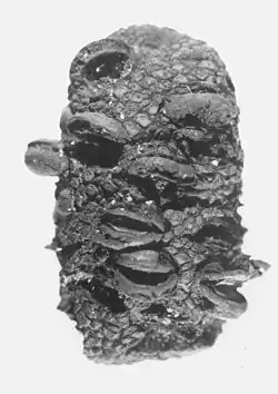 Banksia kingii is an extinct species of tree or shrub in the plant genus Banksia. It is known only from fossil leaves and fruiting "cones" found in Late Pleistocene sediment at Melaleuca Inlet in western Tasmania. These were discovered by Deny King in the workings of his tin mine.[1] The climate was most likely as cool as or cooler than it is at Melaleuca now (an average yearly temperature of 11.5C, an average temperature of the coldest month of 4.5 °C, a mean maximum temperature of the warmest month of 20 °C) , and possibly wetter, over 2400 mm annually.[2]