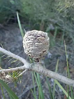 This banksia does not have a lignotuber and is killed by fire, when the follicles open and release the seeds.[6]
