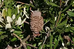 One field study found 30% of seeds were eaten by insects between bushfires.[24] Insects recovered from inflorescences include the banksia boring moth (Arotrophora arcuatalis), younger instars of which eat flower and bract parts before tunneling into the woody axis of the spike as they get older and boring into follicles and eating seeds. Other seed predators include unidentified species of moth of the genera Cryptophasa and Xylorycta, as well as Scieropepla rimata, Chalarotona intabescens and Chalarotona melipnoa and an unidentified weevil species.[27] The fungal species Asterina systema-solare, Episphaerella banksiae and Lincostromea banksiae have been recorded on the leaves.[6]