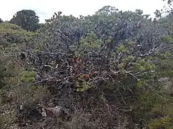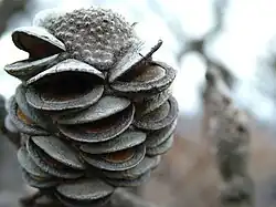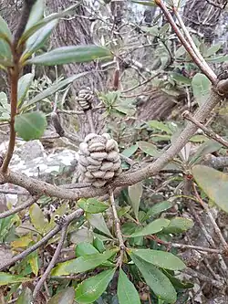 Banksia saxicola grows as a tall upright tree to 13 m (43 ft) high at Wilsons Promontory, or as a sprawling shrub in the Grampians.[1] At the latter location, plants maintain their spreading habit even in more sheltered parts, reaching around 5 m (20 ft) high there but restricted to 2 m (7 ft) high in more exposed areas. New growth appears in summer.[2] The 2–4 mm (0.08–0.2 in) thick bark is brown on younger plants and grey—and often covered with lichen—on older plants. The leathery dark green leaves are roughly oval and measure 4 to 10 cm (1.6 to 3.9 in) long by 1 to 3.5 cm (0.4 to 1.4 in) wide. They are arranged in whorls along the stems on 5–10 mm (0.2–0.4 in) long petioles.[1] The flowering period is from January to March, with some occasional late flowers in May.[2] The cylindrical flower spikes, known as inflorescences, arising from two- to six-year-old branches. They are 3.5 to 8 cm (1.4 to 3.1 in) high and 5 to 6 cm (2.0 to 2.4 in) wide at anthesis. Flower parts fall off the ageing spikes, leaving them bare. They swell and develop 20 to 60 follicles that are covered in fine fur and open only when burnt in fire.[1]