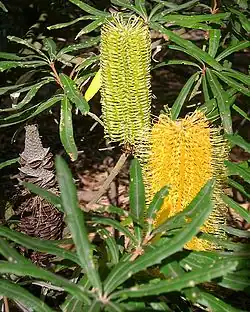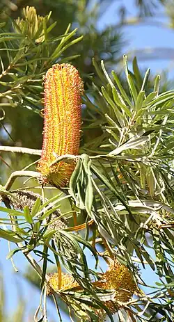 The river banksia generally grows as a tree up to 25 metres (80 ft) tall with a usually brown to grey trunk covered with a hard grey furrowed bark.[3] The tree trunk is often straight and tall as the species generally grows in sheltered forest areas. The leaves are arranged on the stems in whorls. Measuring 5–12 cm (2.0–4.7 in) long and 1–1.8 cm (0.4–0.7 in) across, they are linear in shape with serrated margins. The upper leaf surface is finely furred becoming smooth, while the undersurface is covered in white fur.[3]