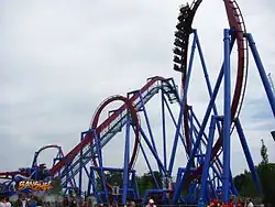 Banshee stands 167 feet (51 m) tall and features a first drop of 150 feet (46 m).[46][47] With a length of 4,124 feet (1,257 m), the ride became the longest inverted roller coaster in the world when it opened in 2014.[48][1][49] The ride includes seven inversions: two vertical loops, a dive loop, a zero-g roll, a pretzel knot, and an inline twist.[46] It is also tied with Montu at Busch Gardens Tampa for achieving the most inversions on any inverted coaster.[50] The first vertical loop wraps around the lift hill, an element that can be found on two other Bolliger & Mabillard roller coasters, which are The Riddler's Revenge at Six Flags Magic Mountain and Kumba at Busch Gardens Tampa.[51] Riders experience speeds of up to 68 miles per hour (109 km/h) on the ride, which lasts two minutes and forty seconds.[46] Due to the terrain underneath Banshee, the highest point of the lift hill is 208 feet (63 m) above the lowest point of the ride, which is at the bottom of the pretzel knot.[3][29] As a result, Banshee reaches its maximum speed approximately halfway through the layout, rather than after the first drop, as is the case with most roller coasters.[3][47]