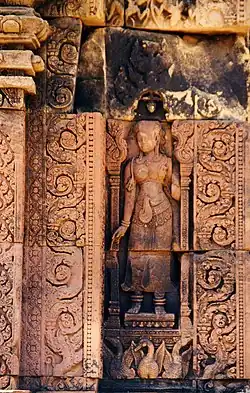 The temple's modern name, Banteay Srei—citadel of the women, or citadel of beauty—is probably related to the intricacy of the bas relief carvings found on the walls and the tiny dimensions of the buildings themselves.[8] Some have speculated that it relates to the many devatas carved into the walls of the buildings.[9]