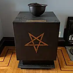 The Baphometic Bowl of Wisdom is a memorial sculpture commissioned by The Satanic Temple, a somber 23-inch black cube inscribed with inverted pentagrams beneath an upturned soldier's helmet.[1] The memorial to fallen soldiers was a collaboration between sculptor Chris Andres and metalworker Adam Volpe.[2][3]