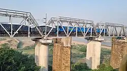 The river flows in all fury during the rains in its upper reaches and has washed away two bridges constructed successively on the Grand Trunk Road. The great stone bridge across the river near Barhi, in Hazaribagh district, built around 1848, was washed away in 1913, after a fall of 250 millimetres (10 in) of rain in 24 hours. The narrow iron bridge, which was built to replace it, withstood the strains of troop movement during the Second World War, but gave way in 1946, with another great flood.[2] A new bridge built in the 1950s has withstood the fury of the river.