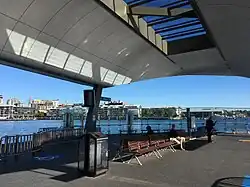 Both wharves at Barangaroo are measured at 48 meters long and 23 meters wide, with both wharves being able to accommodate a maximum of eight ferries at any given time, with two on each of its four berths.[17] Designed by Aurecon and Cox Architecture, whom had previously helped design the wharves of Brisbane's ferry network,[20] the complex is similar to the design of wharves on Sydney Harbour redeveloped in the 2010s, with large, "curved silver roofs" as the artistic centerpiece of the structure.[6] The complex also features "fully accessible pontoons, seated waiting areas, weather protection, [and] real-time service information", with open, ungated access accompanied by opal card reader nodes at the entrance to both wharves.[6] Lead architect David Holm stated that the wharf's design was crafted with the "language that is consistent with the suite of Sydney harbour ferry wharves" in mind, describing the "twofold" process of resolving function and identity. He further commented that the wharf's function, the "delivery of streamlined passenger flows and a simplicity of functional layout" was contrasted with its identity, an "expression of Sydney harbour's iconic maritime history and architectural form.[20]