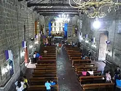 The interiors revealed the exposed wooden trusses that support the church's roofing, lacking a ceiling that is usually seen in churches. The structure has not been plastered, exposing the adobe bricks on which the church was made.