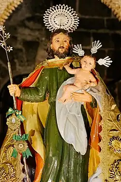 The miraculous image of San Jose de Baras (Spanish: El Glorioso Patriarca Señor San José de Baras) is a detallado image of St. Joseph cradling and facing the Christ Child on one arm and a traditional staff with a sheaf of lilies on the other. He stands atop a cloud base with the heads of two cherubs visible. The image is carved with a classic green robe with a bright golden yellow cape and a hat on his back. The Christ Child sits on a white long robe facing the beholder with right palm pointing to St. Joseph.