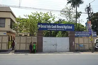 Barasat Indira Gandhi Memorial High School is an English Medium Co-Educational School at Jessore Road, Barasat. It was founded by Shri Shyam Deo Rai.[4] It was inaugurated in late 25 December 1989 at 12.00.00 AM (Indian Standard Time). The current principal of the school is Mrs Sunanda Jaiswal and the vice principal is Purnima Singh.[5] It is affiliated to the Central Board of Secondary Education, New Delhi.