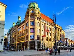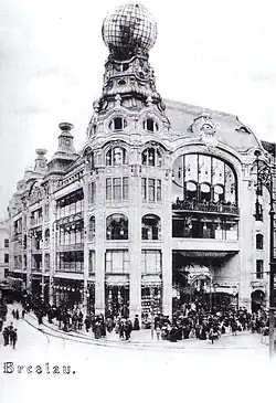 Built from 1902 to 1904 for the German Jewish merchant family Barasch by architect Georg Schneider, the store was opened on 4 October 1904. In 1929, the original Art Nouveau facade facing the market square was given a simpler, modernist look; the huge glazing above the main entrance was replaced with more conventional window rows. The large glass globe on the main tower at the corner of Ulica Szewska and Kurzy Targ (German: Hintermarkt), which had been damaged by lightning, was also removed.