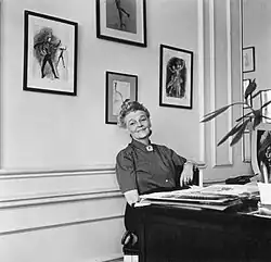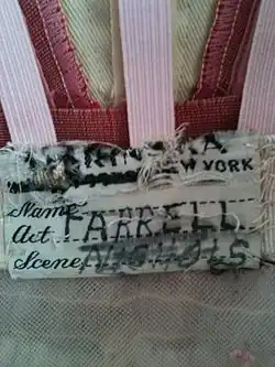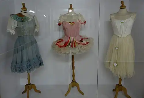 Karinska collaborated with Balanchine on seventy-five ballets in all.[16] The first ballet she made for Balanchine from her own designs was Bourrée Fantasque in 1949.[17] In 1956, for Balanchine's Allegro Brillante, Karinska created the knee-length chiffon ballet dress, which has also become a standard design for ballet costumes. And in 2014, her costumes were recreated for a production of George Balanchine's A Midsummer Night's Dream when the original source of gold trim was found by Marc Happel, the NYC Ballet costume director, in the original shop Tinsel Trading, whose owner's grandfather had supplied Karinska in 1933.[18] The Smithsonian has one of her other costume gowns on display.[19]