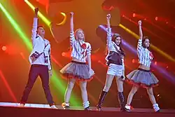 On stage, Popović was accompanied by their dancers from the dance studio Eureka.[11] One of them (the blond girl) was Sara Kastratović, 13-year-old daughter of Zoran and Indira Kastratović, coaches of the women's handball team Vardar SCBT,[12] who didn't even think to follow up her parents' profession and pursues her passion for hip hop.[13]