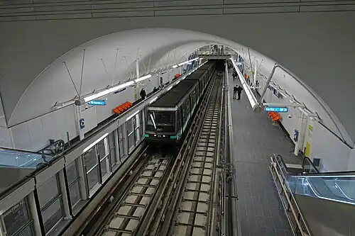 The station was designed by LIN (Finn Geipel and Giulia Andi).[11] The design uses white corrugated metal panels on the walls and vaulted ceiling, as well as large circular light fittings – a similar concept was also used at Aimé Césaire and Mairie d'Aubervilliers stations on line 12.[12]