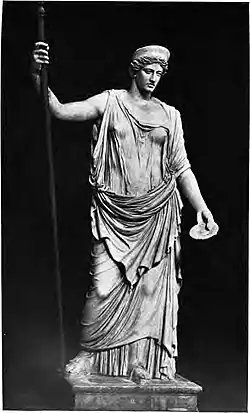 The statue depicts the goddess standing, wearing a crown and peplos (which clings to show her form beneath and has dropped from her left shoulder, nearly revealing her breast) and now resting the weight of her restored right arm on a standing sceptre and carrying a patera in her left. This sculpture is a Roman copy of a Greek original, possibly by Alcamenes; Lewis Richard Farnell suggested that "the not infrequent repetition of the type suggests a Greek original of some celebrity."[1] It is now in the Museo Pio-Clementino in the Vatican Museums. It is also sometimes identified as a Ceres. The right arm and the nose are restorations.
