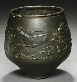 The first barbotine technique in pottery styling was in use in the ancient world. The Egyptians were known to have used barbotine design.[2] As another example, Middle Minoan pottery from Knossos on the island of Crete in present-day Greece includes a barbotine pottery style,[3] and it is common in Ancient Roman pottery, where the colour may often be the same as the rest of the vessel.