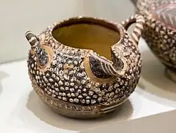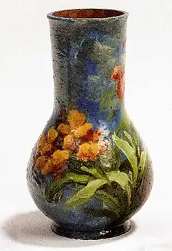 The third sense of the term describes a technique developed by Ernest Chaplet, the secret of which was later sold by him to Haviland & Co. This was a method of painting art pottery in brightly-coloured slips, in French also called peinture à la barbotine or in gouache vitrifiable. In this type there may be some impasto, but the decoration is essentially close to the surface. The term "Barbotine ware" also describes the American art pottery that emulated the Haviland pottery, which made a great impression at the 1876 Philadelphia Centennial Exposition.[5] In America this led to the technique sometimes being called "Limoges ware", Haviland being a large maker of Limoges porcelain. In fact all their barbotine wares were made at their factory in Auteuil, near Paris.[6]