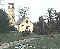 The lighthouse was established in 1829 through the efforts of Thomas B. Campbell. The conical tower and attached keeper's cottage were constructed of fieldstone, with a natural, emplaced foundation. The light was emitted by eleven lamps with 14-inch (360 mm) reflectors. It was the first lighthouse in the world to be powered by natural gas, which Campbell transported from a "burning spring" about a mile distant by means of wooden pipes. Thirty years later, in 1859, the lighthouse was deactivated, but it still stands lit today after over 100 years in private ownership, it is now owned by the New York State Office of Parks, Recreation, and Historic Preservation.