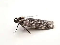 the labial palpi, which are uniformly blackish except for a pale patch on the inner surface of the second segment near the base, and (in fresh specimens) by the presence of a tuft of shining scales on the posterior margin of the thorax.[2]